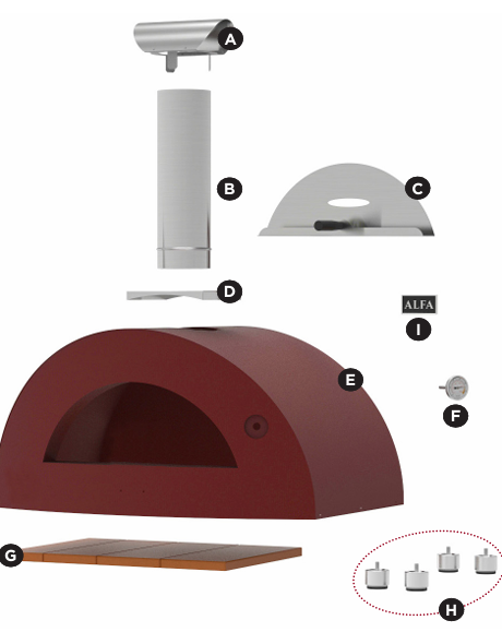 Farba červená antik. Vďaka proporciám, tvaru a patentovanému systému™ prúdenia vzduchu Alfa Flue System vo vnútri rúry dokáže 3 Pizze udržať maximálne teplo a znížiť tepelné straty. Teplo je dlhodobo zachytávané vo vnútri šamotových tehál Alfa s vysokou hustotou, takže rúra ľahko dosiahne ideálnu teplotu na rovnomerné pečenie.