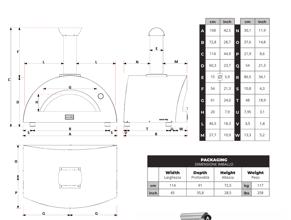Farba šedá. Vďaka proporciám, tvaru a patentovanému systému™ prúdenia vzduchu Alfa Flue System vo vnútri rúry dokáže 3 Pizze udržať maximálne teplo a znížiť tepelné straty. Teplo je dlhodobo zachytávané vo vnútri šamotových tehál Alfa s vysokou hustotou, takže rúra ľahko dosiahne ideálnu teplotu na rovnomerné pečenie.