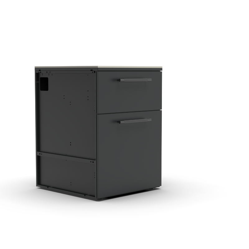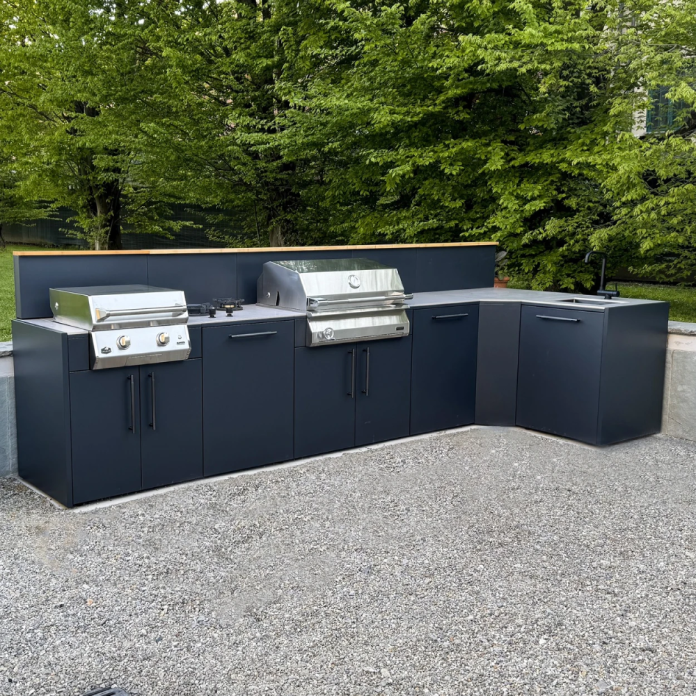 Systém s dvoma zásuvkami s jemným uzatváraním a pracovná doska z Neolithu ponúkajú diskrétnu, poveternostným podmienkam odolnú funkčnosť - ideálne na udržiavanie čistoty a kontinuity dizajnu v modulárnych rozloženiach.