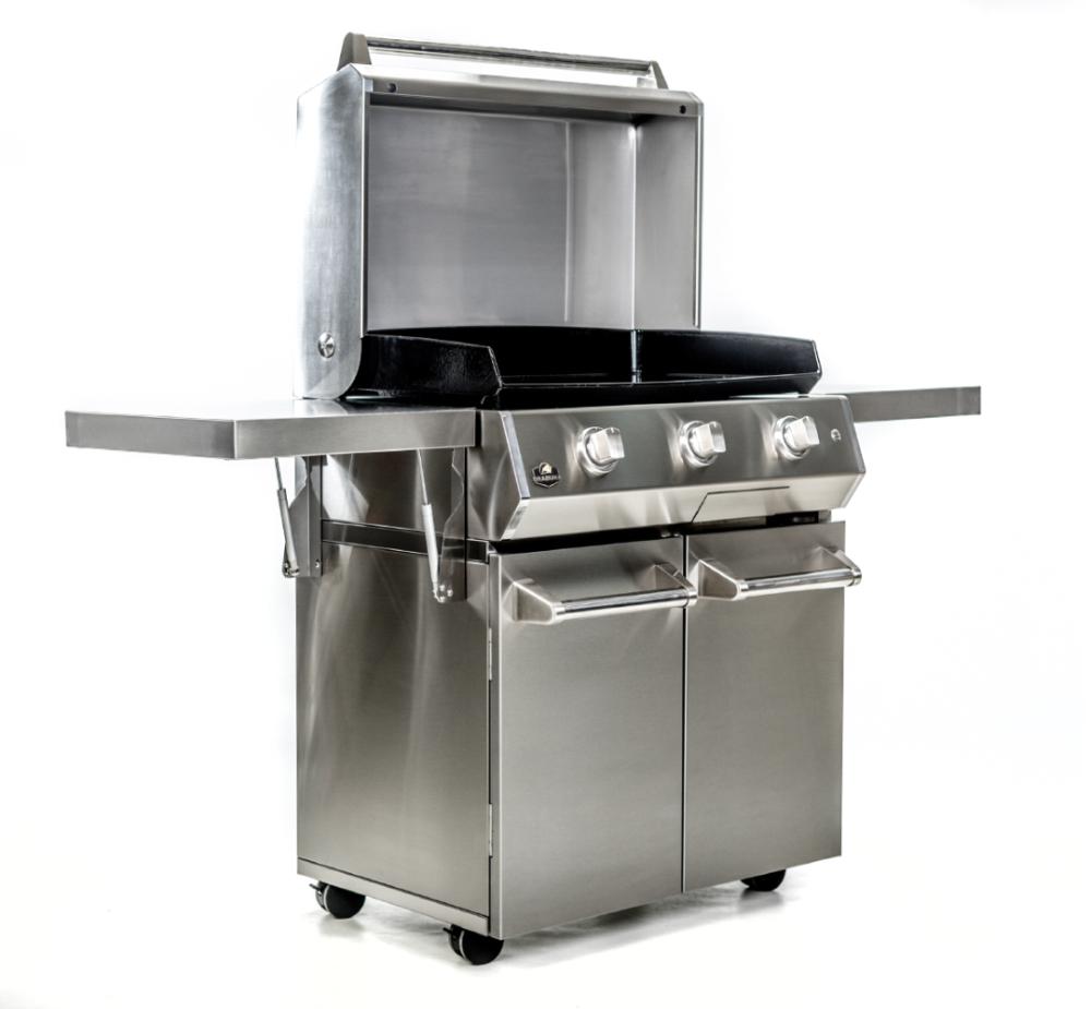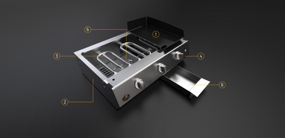 Luxusný plynový plancha gril s troma horákmi. Perfektná kombinácia šasi z nehrdzavejúcej ocele 304 a 8 mm čiernej smaltovanej vysokokvalitnej liatinovej dosky. Horáky z nehrdzavejúcej ocele. Bezpečnostný termočlánok.
