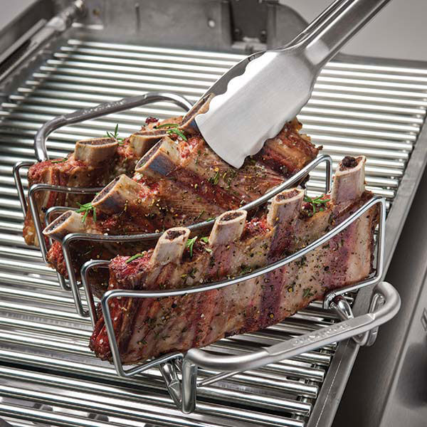 Velková dĺžka aj s madlami: 38,5 cm, šírka: 22 cm, výška: 10 cm, hrúbka drôtu: 0,7 cm, 5 priehradiek pre vloženie rebier, materiál: nerezová oceľ.