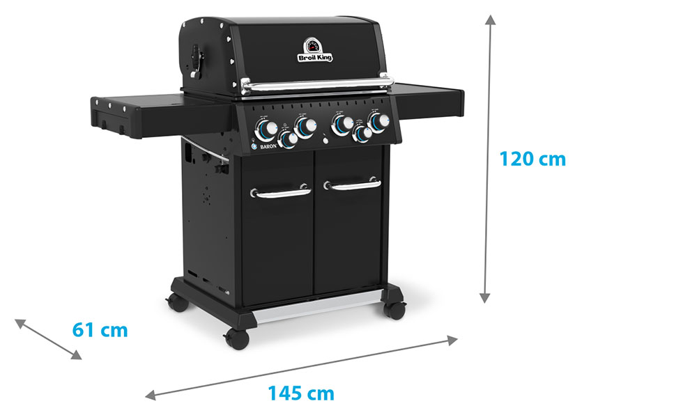Broil King - Baron 490 v základnej výbave disponuje štyrmi hlavnými horáky, bočným varičom a elektrickým ražňom s prídavným zadným horákom pre ražnenie.