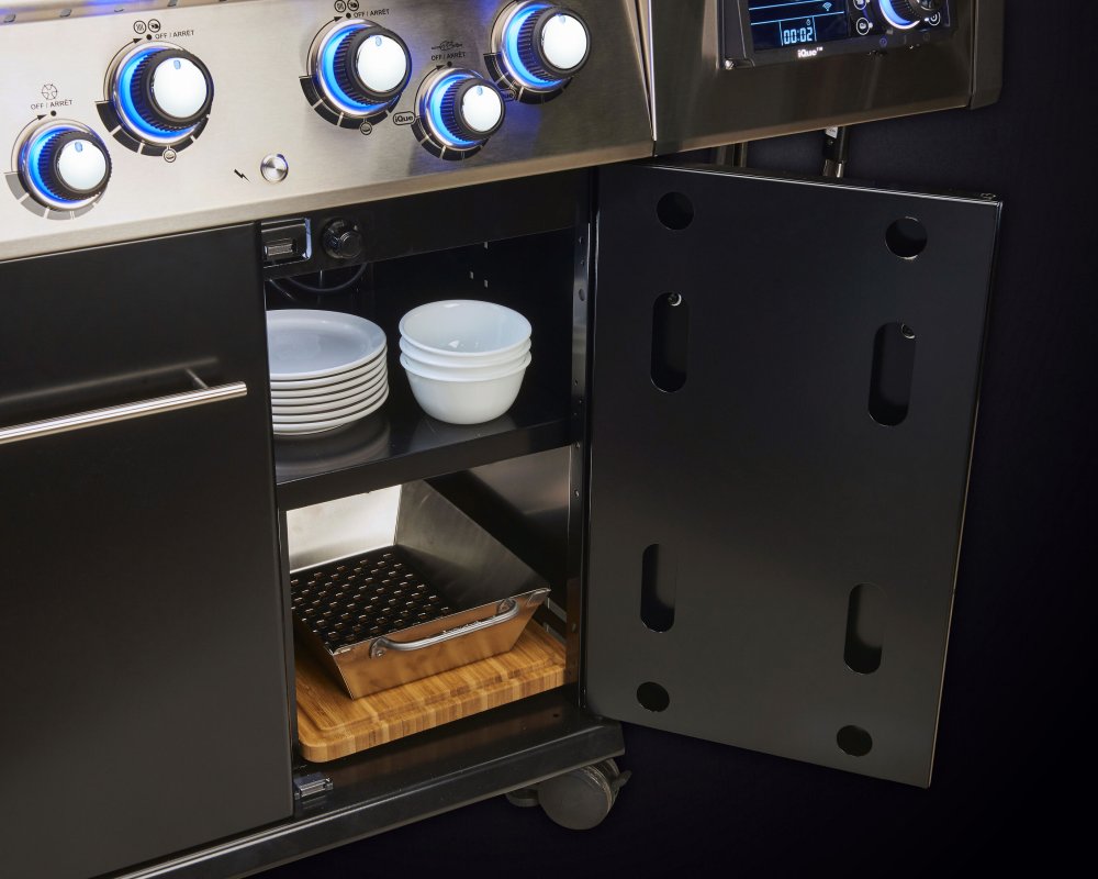 Riadiaca jednotka smart iQue™ je umiestnená v pravej bočnej polici a ponúka všetko pre pohodlné grilovanie na najvyššej úrovni. Nepriame grilovanie v rozsahu nízkych teplôt alebo grilovanie pri vysokých teplotách, údenie, údenie, pečenie, pečenie alebo používanie grilu – iQue™ na riadenie každého procesu grilovania pre dokonalé výsledky grilovania pri optimálne konštantných teplotách.Vďaka 3 rôznym predvoľbám je príprava najrôznejších jedál hračkou: Z predvolieb "SMOKE - Dym", "ROAST - Pečenie", "GRIL - Gril" vyberiete vhodný program grilovania a spustíte odporúčané horáky v závislosti od programu. Áno - riadiaca jednotka riadi výkon horákov a viete ju vládať z apky v mobile.