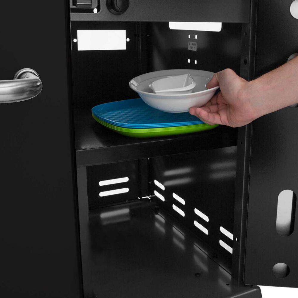 Do podvozku grilu Regal S 490 sa pohodlne zmestí 10 kg plynová fľaša a navyše tu nájdete poličku na ukladanie grilovacích pomôcok.