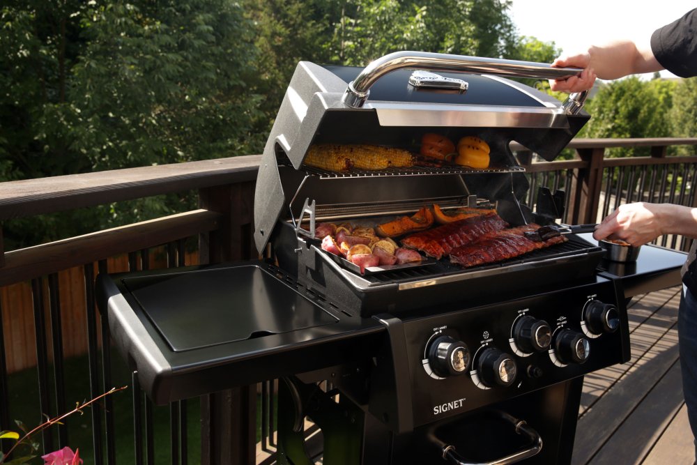 Broil King Signet 390 Shadow je priestranný trojhorákový gril s bočným sporákom, zadným horákom na grilovanie a ražňom s elektromotorom,