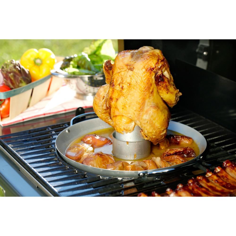 Stojan na pečenie hydiny. Stačí naliať svoju obľúbenú tekutinu (pivo, víno alebo akúkoľvek kombináciu olejov a korenia) do vnútornej časti stojana a na stojan položiť kurča. Pri grilovaní sa do mäsa uvoľnia vône.