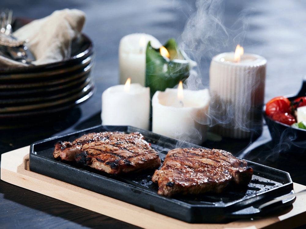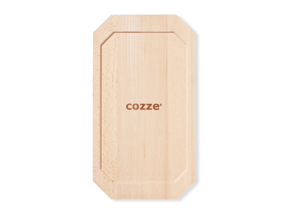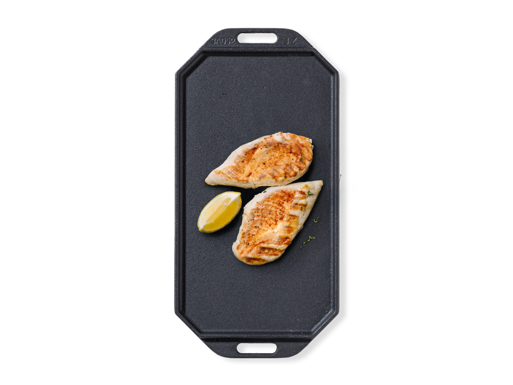 Obojstranná liatinová panvica Cozze s praktickou drevenou doskou a odnímateľnou rukoväťou.