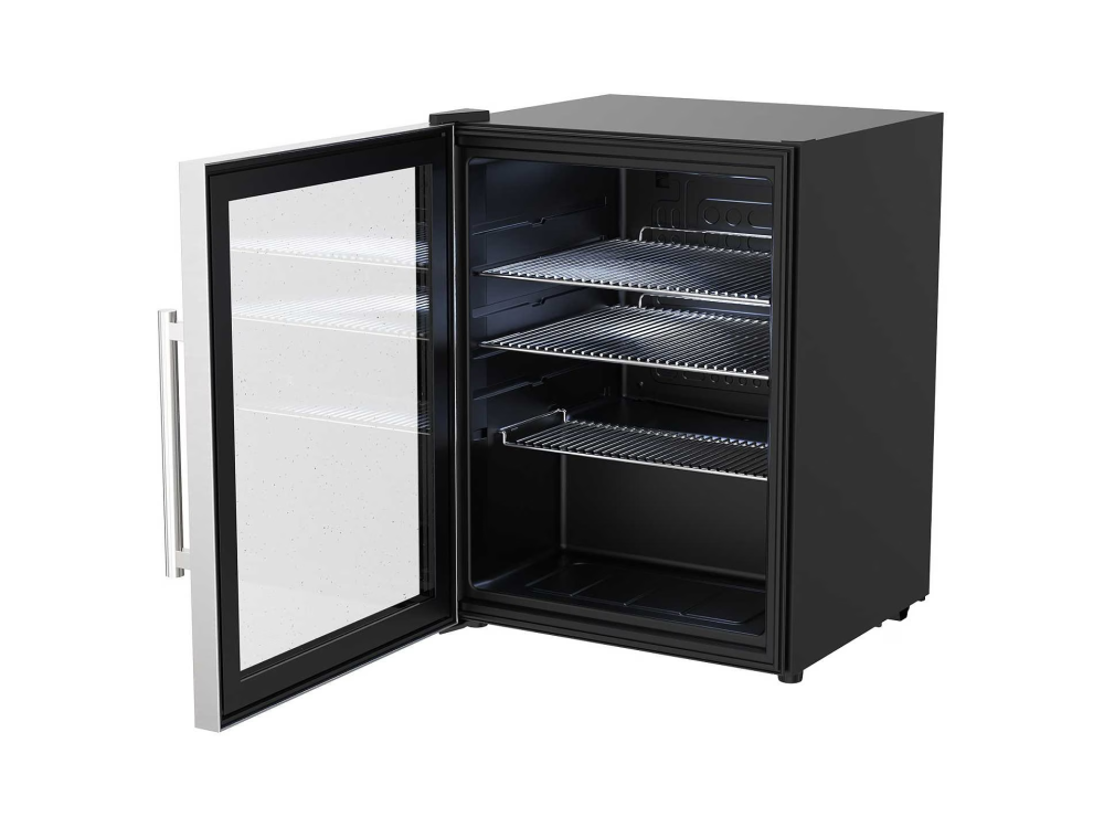 Praktická 60-litrová chladnička s nehrdzavejúcim čelným panelom, sklenou prednou časťou a kompresorovým chladiacim systémom spoľahlivo udržiava nápoje chladené na teplotu 3–18 °C.