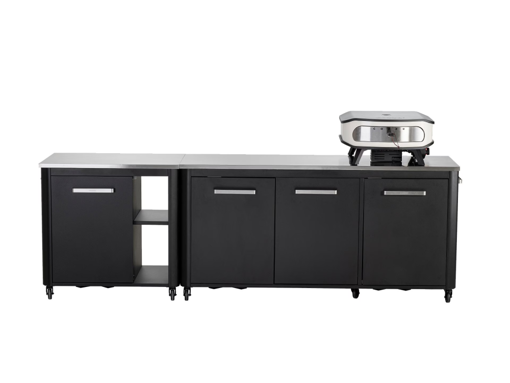 Set záhradnej kuchyne Cozze je ideálnym riešením pre pohodlné pečenie pizze na čerstvom vzduchu. Pracovný stôl s úložným priestorom s dvierkami ponúka pracovnú plochu z nehrdzavejúcej ocele, ktorá je odolná a ľahko sa čistí. Obsahuje úložný priestor pre PB Fľašu za dvierkami. Háčiky a úchyty umožňujú pohodlné odkladanie náradia či utierok. Vďaka kolieskam s brzdami je ľahko presúvateľný a stabilný.