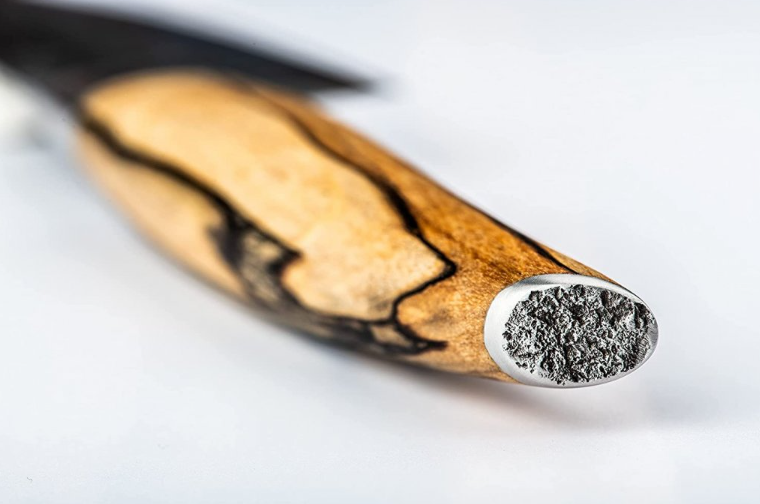 Ostrie je ručne kované v 5 vrstvách japonskej ocele VG10. Rukoväť je vyrobená z koreňového dreva, ktoré je najprv vyplnené živicou. Potom sa lisuje a následne tvaruje. Každý nôž je tak jedinečný povrchom, veľkosťou aj tvarom.
