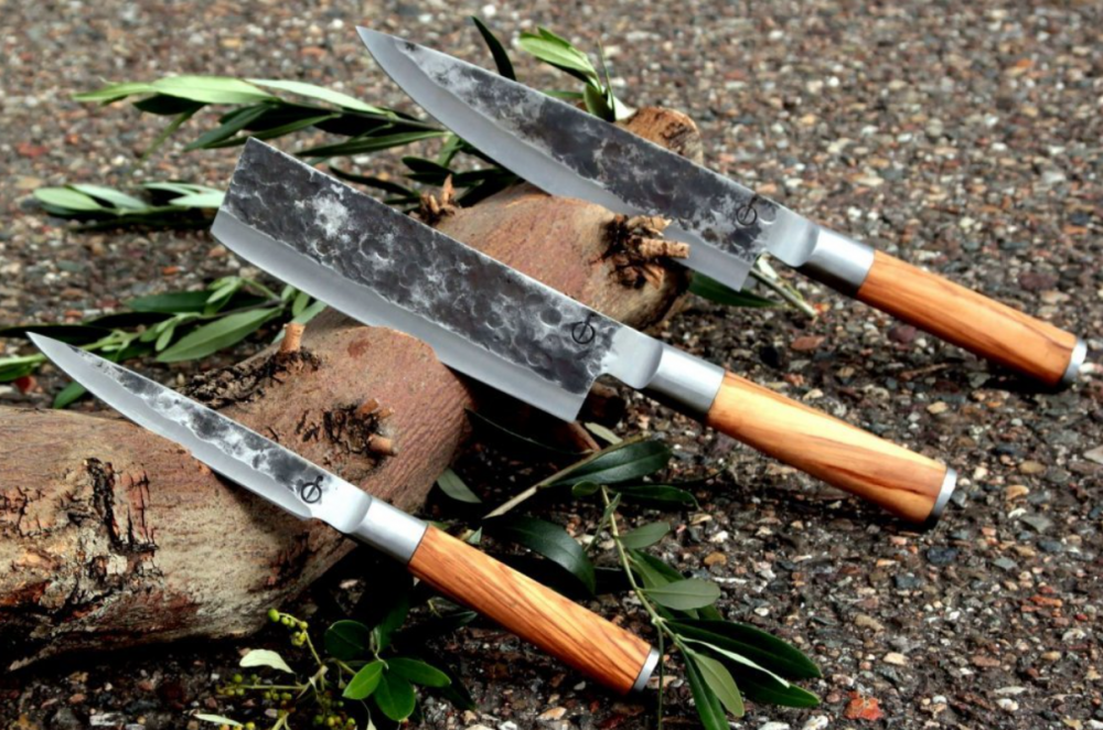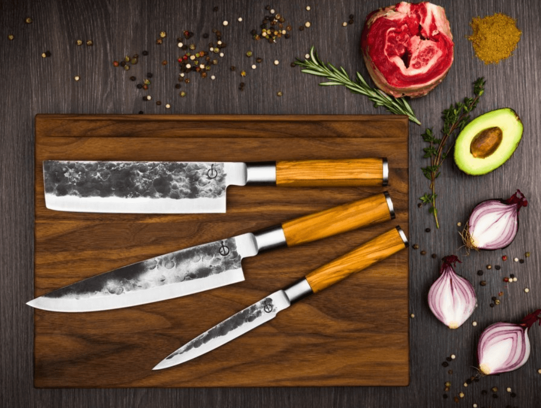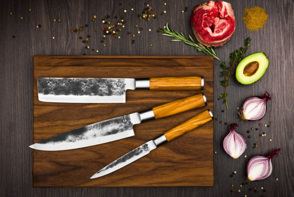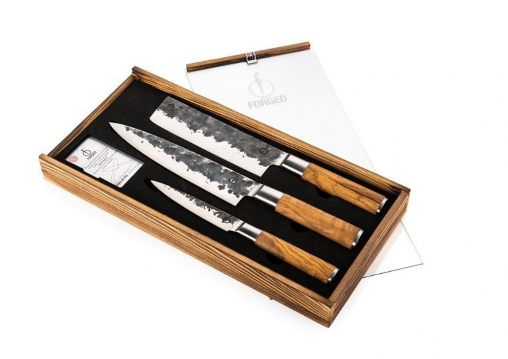 FORGED Olive - 3-dielna sada nožov: kuchársky nôž, japonský nôž na zeleninu, univerzálny nôž.