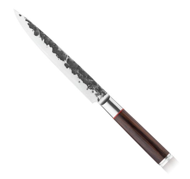 Tmavá drevená rukoväť pôsobí teplo, čo dodáva nožu veľmi príjemný a prirodzený vzhľad. V kombinácii s ručne kovanou čepeľou a decentným červeným detailom na rukoväti je rad Sebra skutočne výnimočný. Inými slovami, s týmto radom získate do vašej kuchyne robustnú a veľmi štýlovú sériu nožov.