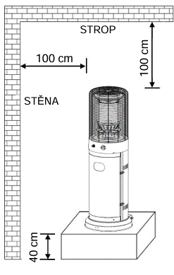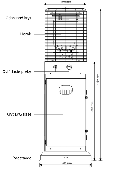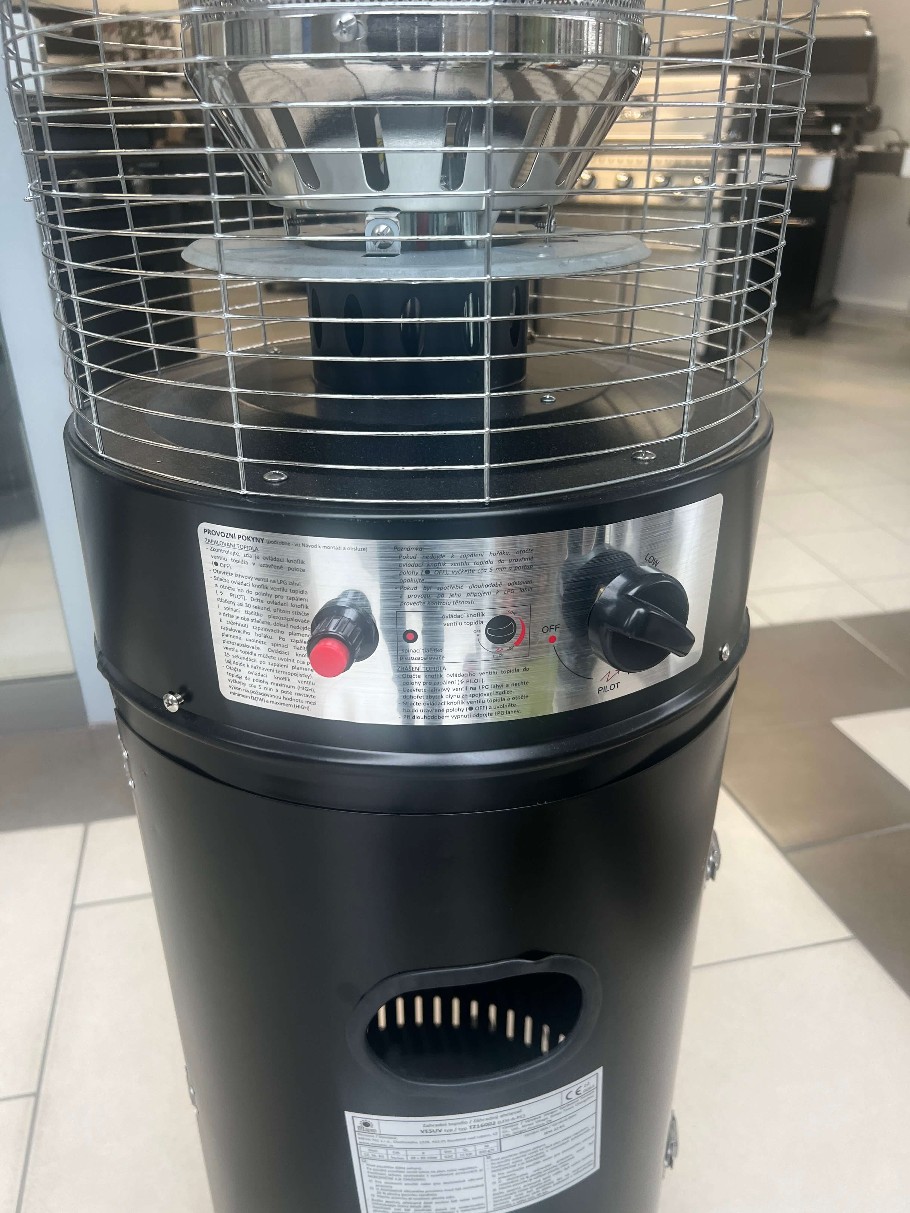 Propan-butánový zahradný ohrievač Vesuv. Dostačuje pre plochu cca 22 až 33m2.