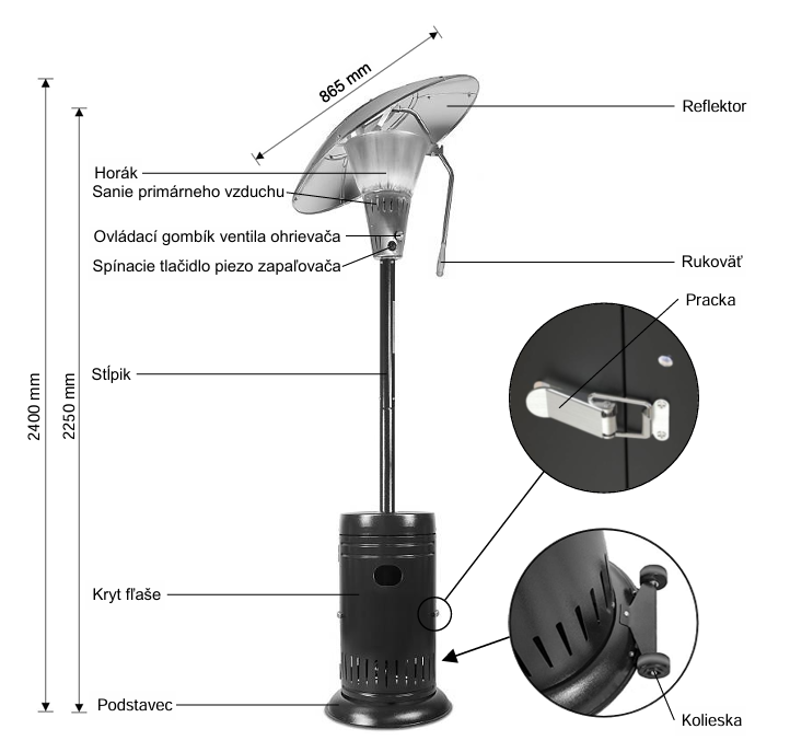 Ideaálny pre plochu cca 26 až 39m2. Ideálne pre tých, ktorým sa klasický dvojmetrový zahradný ohrievač nevojde pod strechu altánku. Výklopný reflektor umožňuje nasmerovať vyžarované teplo do vybraného priestoru. Ohrievač je vybavený plynulou reguláciou výkonu, piezoelektrickým zapaľovaním, kolieskami pre ľahkú prepravu.