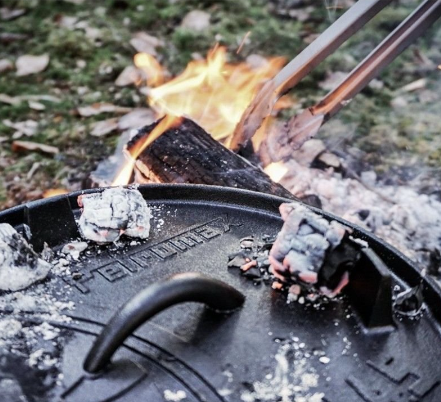 Veko kotlíka slúži zároveň ako panvica vhodná do priameho ohňa. Veko má nožičky.