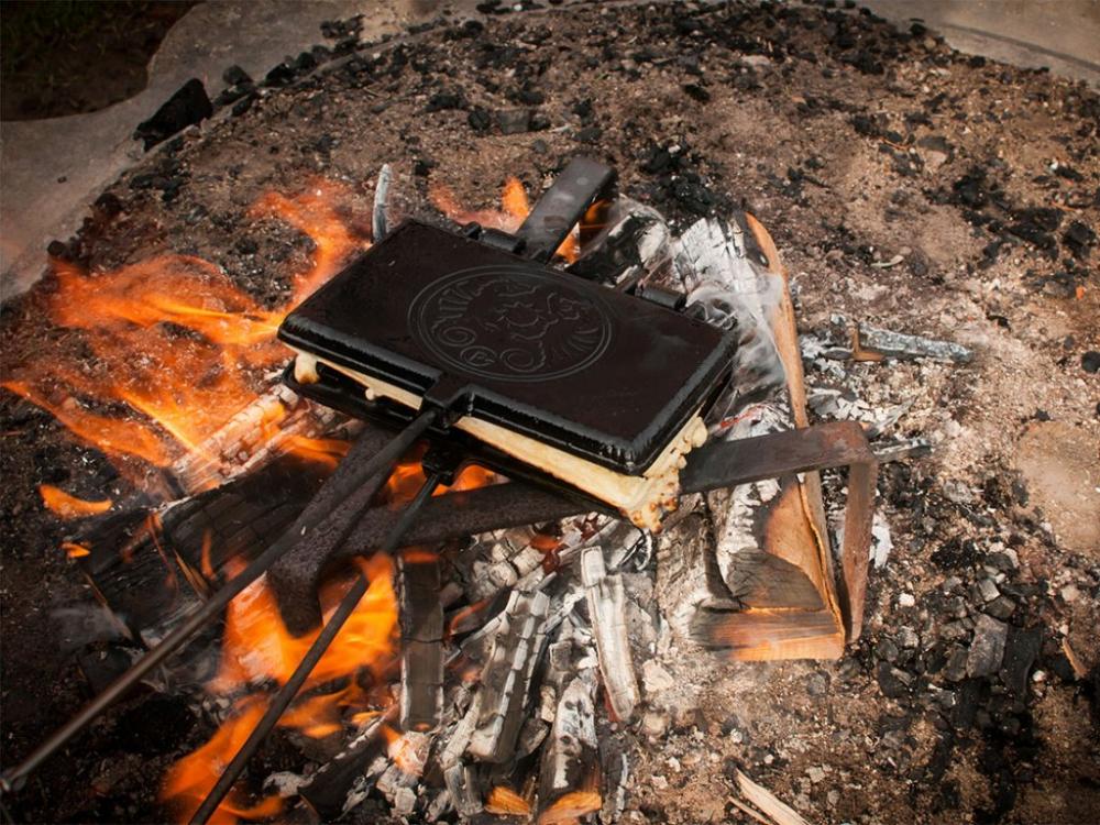 Liatinové formy na vafle,sendviče a hamburgery. Liatinové formy sú určené na varenie na ohni. Vďaka skvelým vlastnostiam liatiny umožňujú ako opekanie, tak využívanie zvyškového tepla na dopekanie. Formy sú zaistené hákom, takže držia bezpečne pohromade.