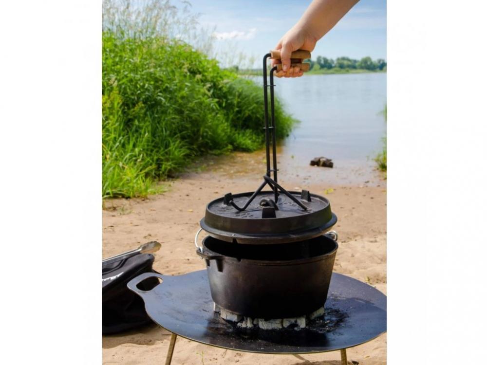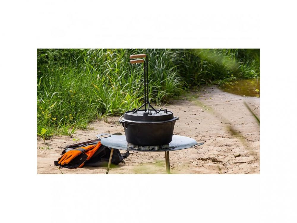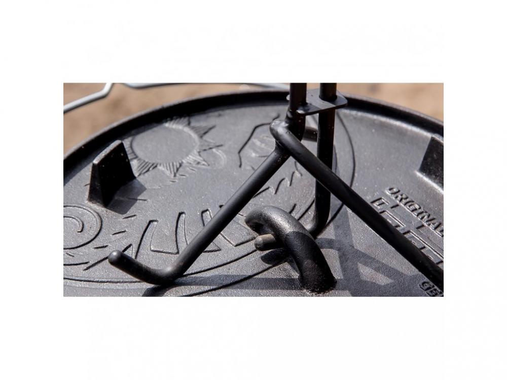 Profesionálny zdviháč pokrievky. Profesionálny zdvihač na horúce pokrievky má upevňovací mechanizmus pre bezpečné a pohodlné držanie pokrievky.