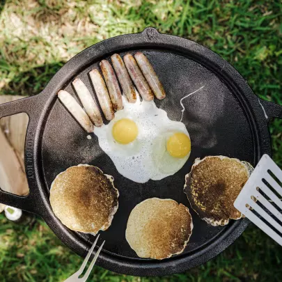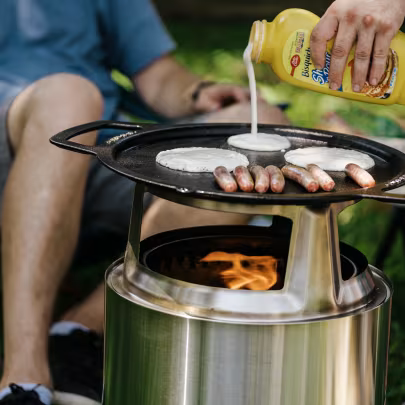 Grilujte na otvorenom ohni na táborisku alebo priamo za vašimi dverami s sadou na grilovanie z liatiny. Predpripravená liatinové grilovacie rošty/dosky a woky akumulujú teplo pre dokonalé opečenie nad bezdymovým ohniskom – či už ide o šťavnatý steak alebo grilovanú zeleninu s náznakom ohňa.