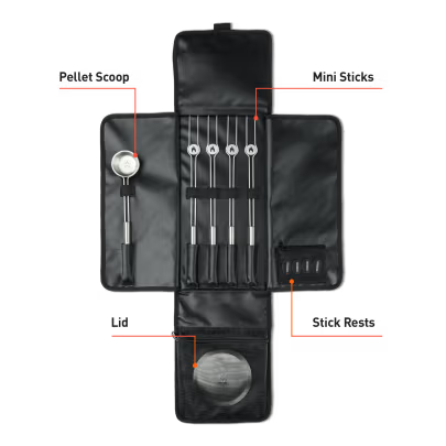 Balenie príslušenstva pre ohnisko Solo Mesa: prenosné kempingové príslušenstvo: 4 mini vidlice z nerezovej ocele + opierky na ne, naberačka na pelety, veko Mesa, púzdro,