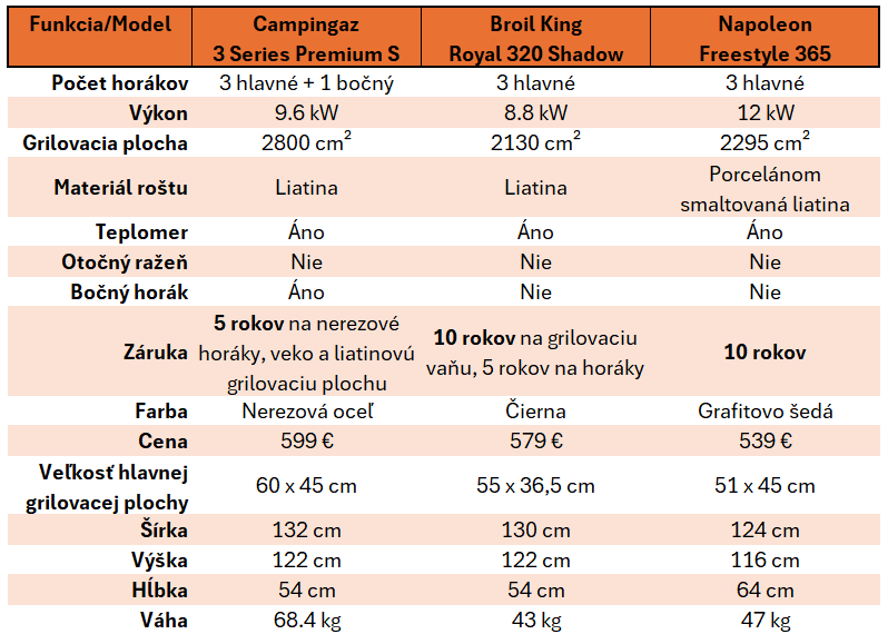 Zjednodušene: ak chcete najväčší gril je pre vás Campingaz, ak chcete najvyšší výkon potom voľte Napoleon, ak hľadáte univerzálny gril s dvietkami vpredu voľte Broil King.