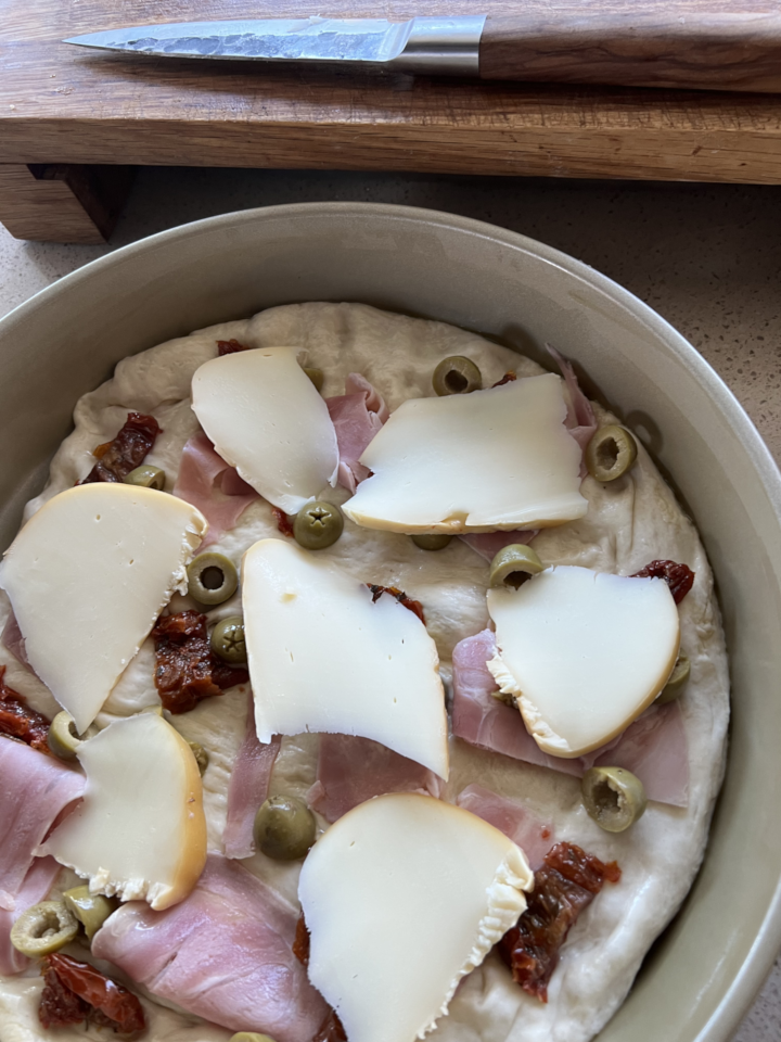 9. Do cesta jemne zatlačíme olivy, sušené poradajky, šunku od kosti, oštiepok alebo pološtiepok /kľudne aj údený/